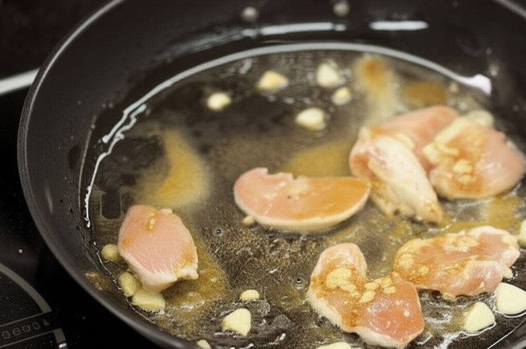 Posiekaj czosnek na cienkie plasterki i zrumień na oleju razem z imbirem i kurczakiem, po czym go usuń.