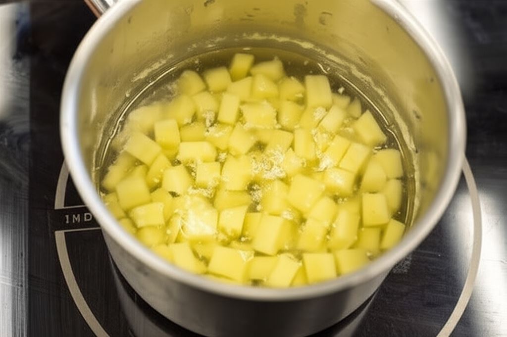 Ziemniaki obierz, potnij w kostkę i ugotuj w małej ilości osolonej wody do półmiękka. Odcedź, zachowując wodę z gotowania.