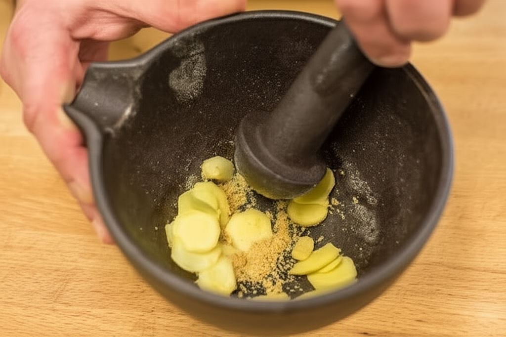Obierz czosnek i imbir, a potem rozetrzyj w moździerzu wraz z ziarnami gorczycy.