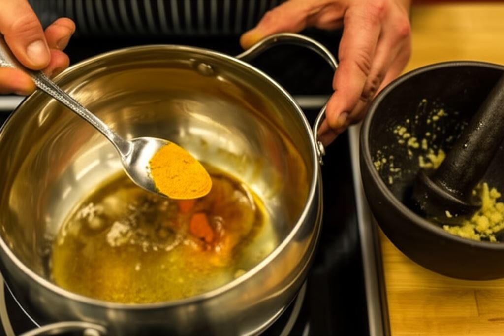 W rondlu albo woku podgrzej klarowane masło. Dodaj przyprawy w proszku, a więc kmin, chili i kurkumę, a po chwili wsyp imbir, czosnek i gorczycę i zamieszaj. Wrzuć pozbawioną pestek i pokrojoną w paski papryczkę chili oraz liście curry. Smaż przez kilkadziesiąt sekund.