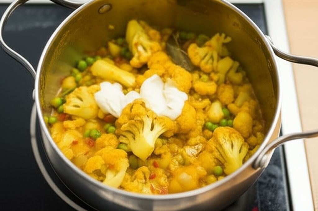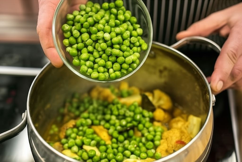 Wsyp ziemniaki, zielony groszek, okrę z obciętymi końcówkami i różyczki kalafiora. Dolej trochę wody pozostałej po gotowaniu ziemniaków i duś, aż warzywa częściowo zmiękną, zachowując jędrność.