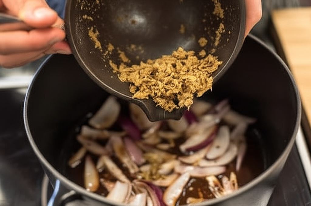 Wsyp imbir, czosnek i nasiona kolendry, uprzednio utłuczone w moździerzu na masę z niewielką ilością wody. Smaż do momentu odparowania wody.
