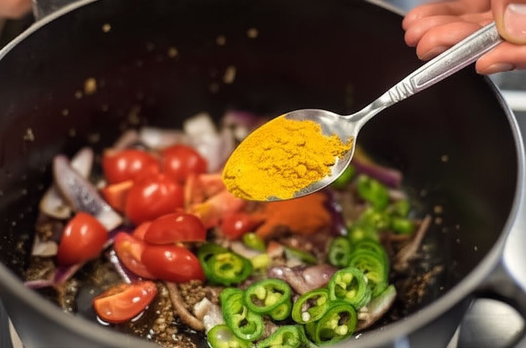 Dodaj chili i kurkumę, zamieszaj. Dorzuć pomidory pokrojone na ósemki i przecięte wzdłuż, wydrążone z nasion zielone chili. Dolej trochę wody i duś przez 4 - 5 min.