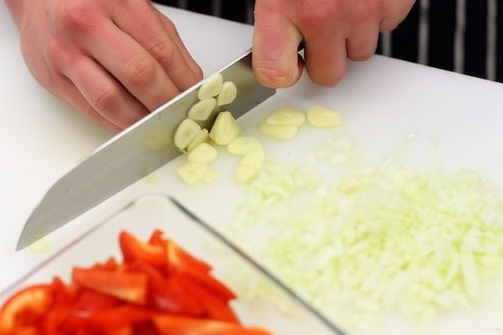 Kurczaka polej niewielką ilością oleju i obsyp przyprawą Knorr. Odłóż na minimum 1 godzinę. Pokrój w kostkę cebulę, marchewkę i paprykę, a czosnek drobno posiekaj.