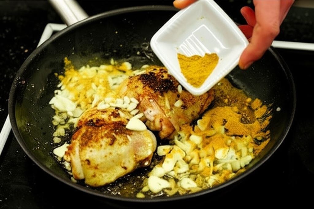 Do usmażonego kurczaka wsyp czosnek, curry i cebulkę i podduś przez moment.