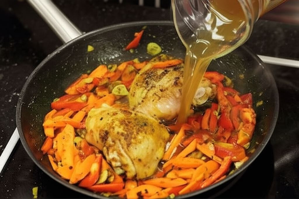 Teraz wsyp warzywa i po chwili smażenia zalej bulionem. Gotuj do miękkości przez około 20 minut.
