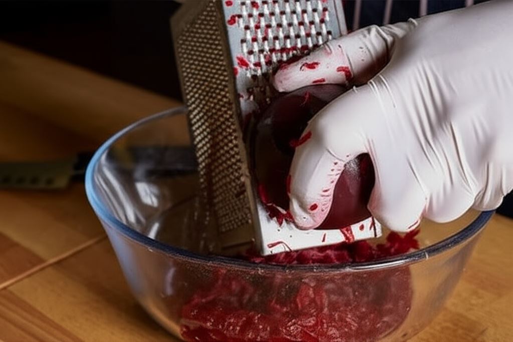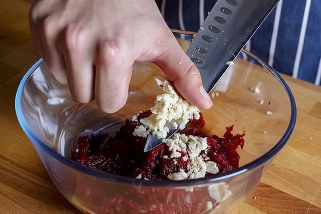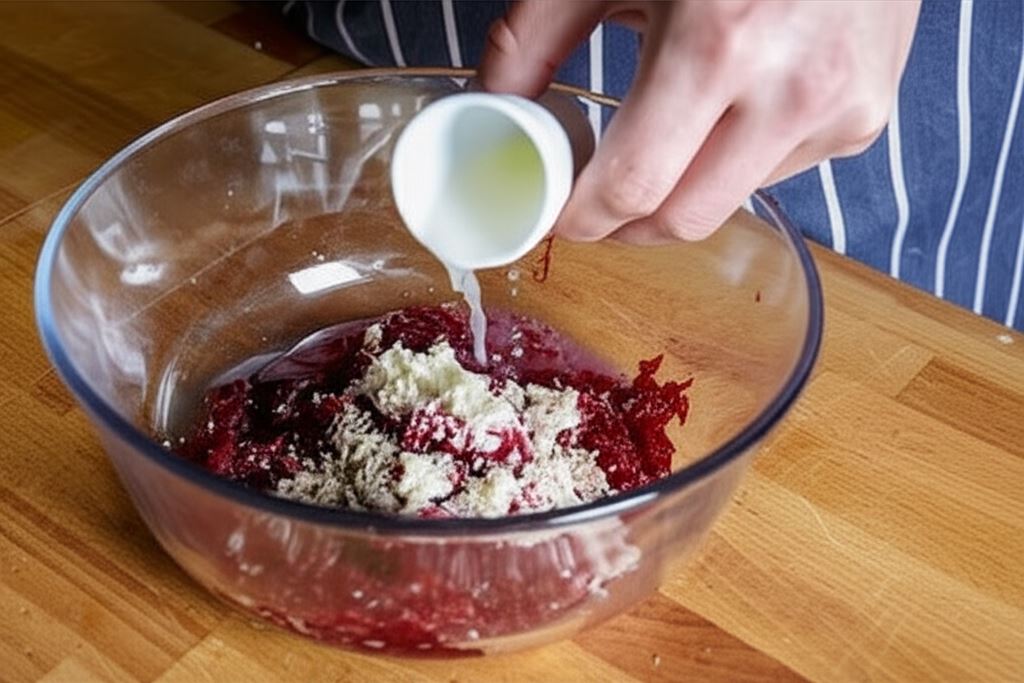 Zetrzyj chrzan na drobnej tarce po obraniu, następnie dodaj go od razu do buraków.