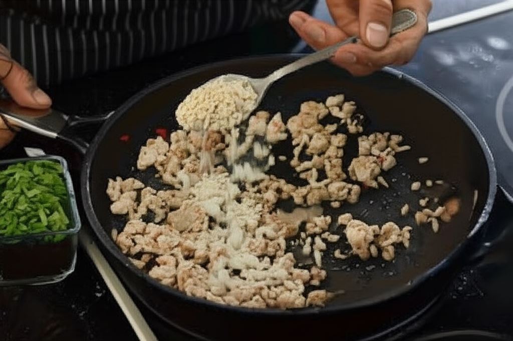 W tym czasie na rozgrzanym tłuszczu podsmażaj mięso mielone. Smaż do momentu, aż stanie się całkowicie suche i dodaj posiekaną papryczkę chili. Na koniec całość dopraw przyprawą Knorr, odrobiną mielonego kminku oraz posiekaną natką pietruszki.
