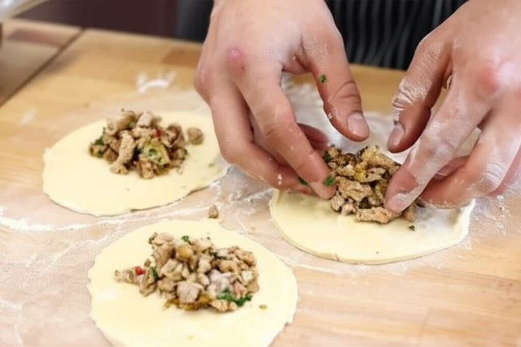 Przygotowane ciasto rozwałkuj na stolnicy posypanej mąką. Z ciasta wytnij duże placki o około 10cm średnicy. Na środek nałóż wystudzony farsz.