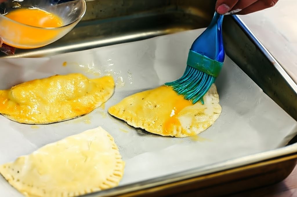 Przygotowane pierogi umieść na blasze wyłożonej papierem do pieczenia i na wierzchu posmaruj roztrzepanym jajkiem. Piecz w piekarniku rozgrzanym do 190°C przez około 20 minut.