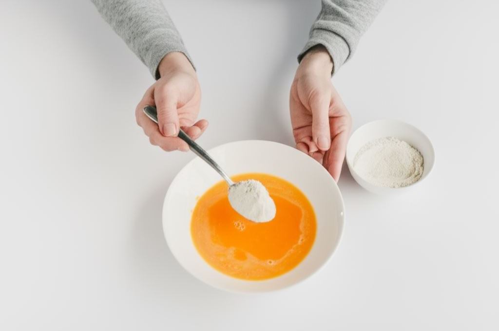 Jajka rozbijamy do miski. Wsypujemy cukier i mąkę. Starannie mieszamy.