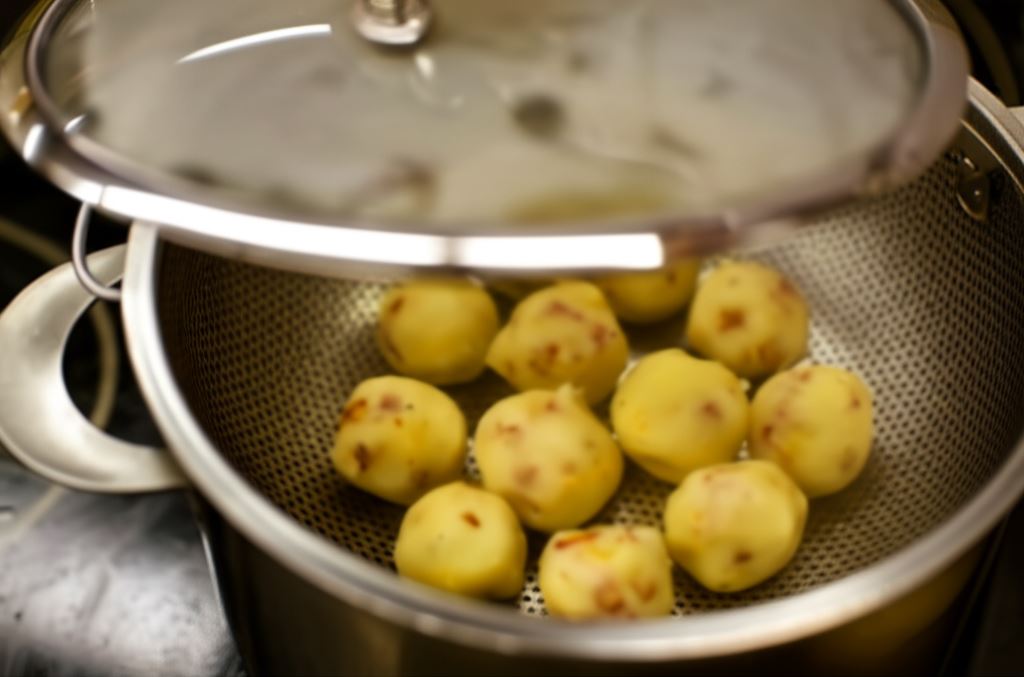 Ziemniaki opłucz i ugotuj w skórce w delikatnie posolonej wodzie do miękkości, około 30 minut. Potem odcedź ziemniaki, obierz i przepuść przez praskę. Do ostygniętych ziemniaków wsyp jajko, obie mąki, szczyptę soli i delikatnie ale energicznie wymieszaj, (nie wyrabiaj ciasta zbyt długo). Formuj rękami z ciasta okrągłe knedle. Umieść je na sitku i gotuj na parze przez około 15 minut.