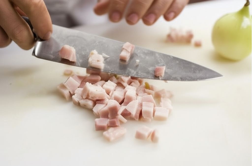Boczek i cebulę posiekaj w małą kostkę. Na patelni obsmaż boczek i przenieś go do miseczki.