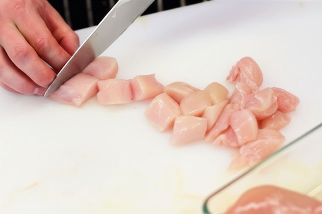 Kurczaka potnij w kostkę o wymiarze 1 centymetra.