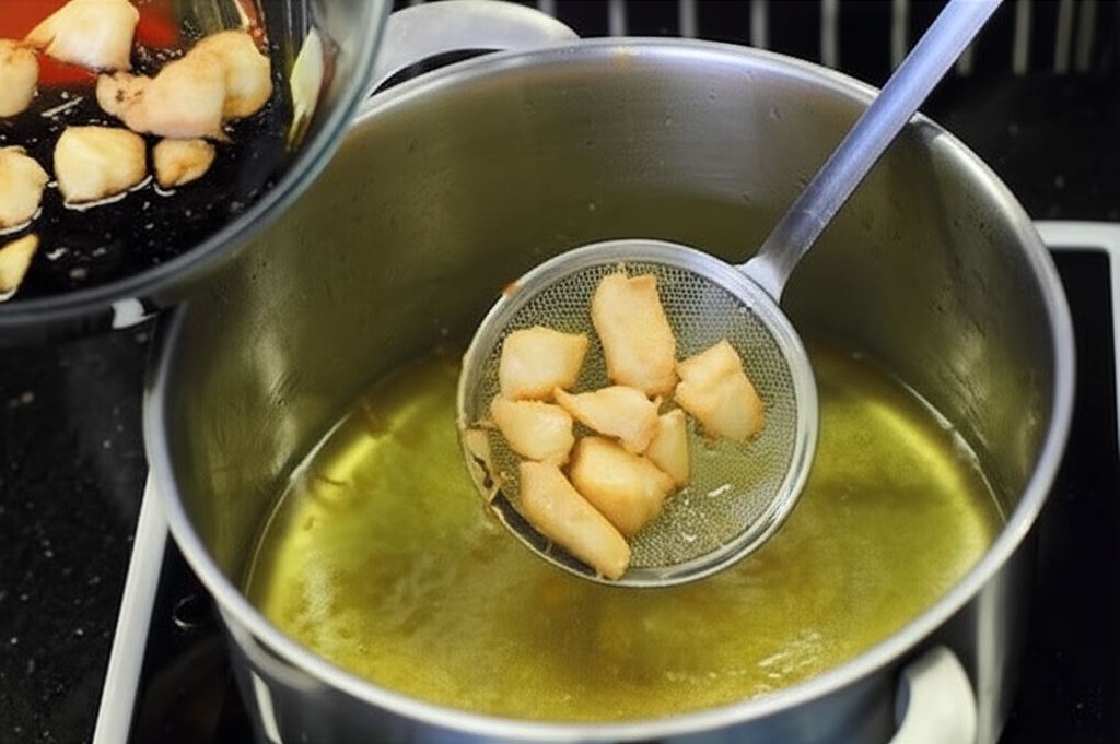 Sekret tego dania tkwi w podwójnym smażeniu kurczaka – najpierw delikatnie obsmażamy mięso, a następnie, po obtoczeniu w specjalnym cieście, smażymy ponownie do uzyskania złocistej, chrupiącej powłoki. Dzięki temu kurczak pozostaje soczysty w środku, a chrupiący na zewnątrz.
