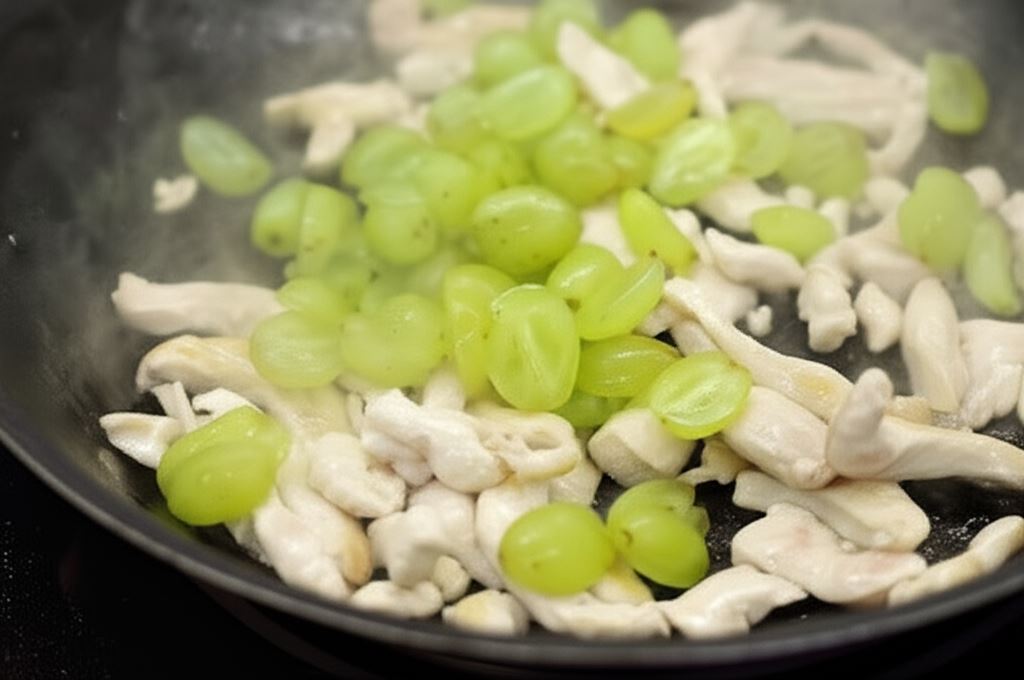 Winogrona przekrój na połówki, dołącz do mięsa.