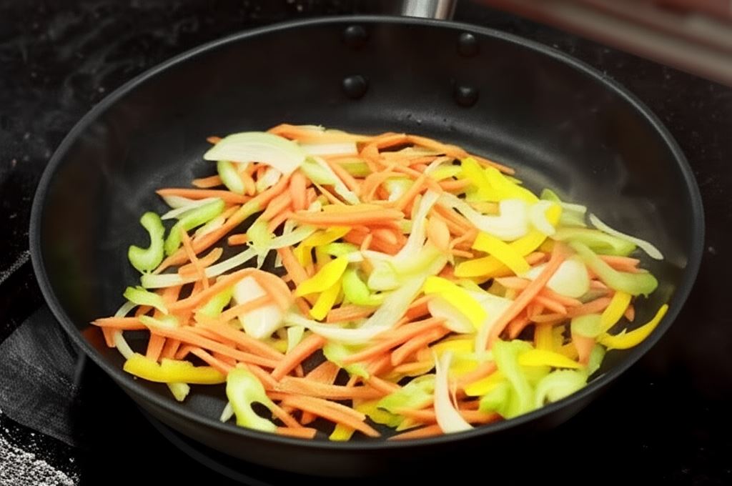 Cebulę posiekaj drobno, a resztę warzyw pokrój w paski. Zrumień je na oleju przez około 3 minuty.