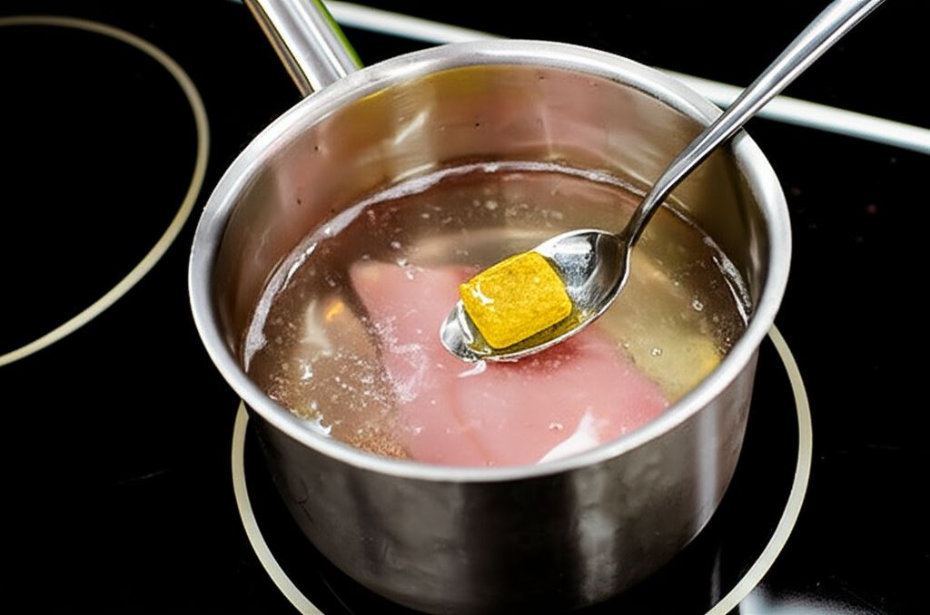 Mięso kurczaka umieść w rondlu, zalej wodą i wsyp Rosół z kury Knorr. Gotuj aż będzie miękkie, a następnie ostudź.
