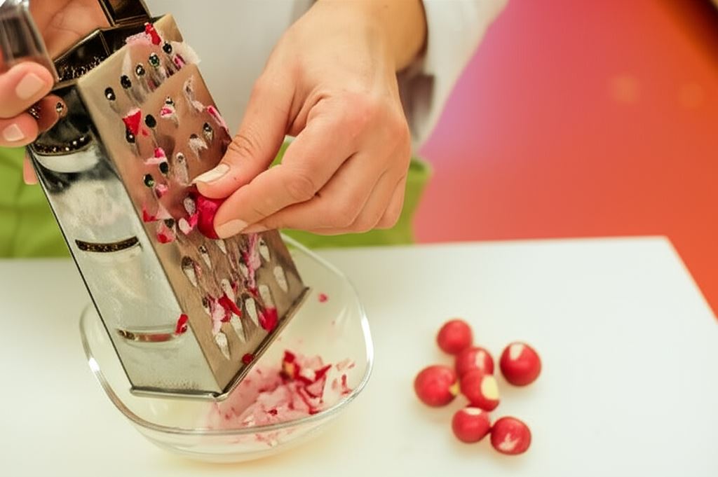 Zetrzyj na tarce pół pęczka rzodkiewek.