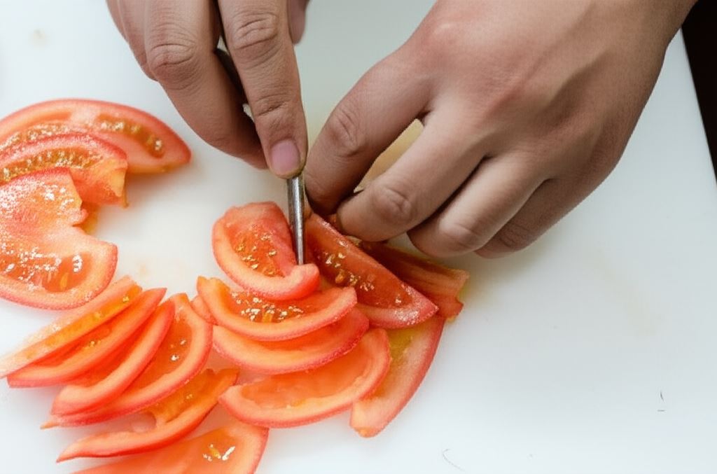 Pomidory zalej wrzątkiem, po czym obierz je ze skórki, podziel na ćwiartki i wydrąż nasiona.
