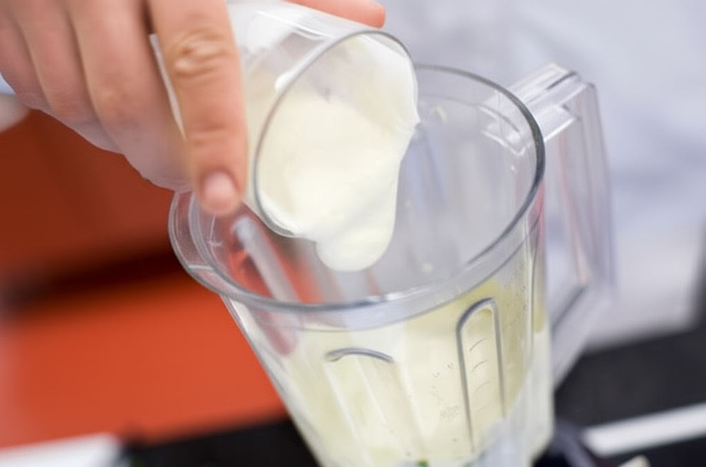 Dodaj jogurt, zblenduj. Połącz z resztą bazylii i wstaw do lodówki.