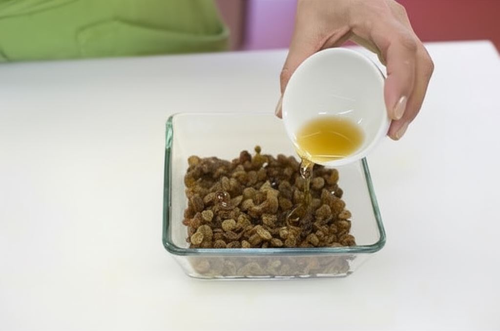 Zalej rodzynki wrzątkiem i odcedź na sitku. Potem umieść w miseczce i polej koniakiem. Nakryj.