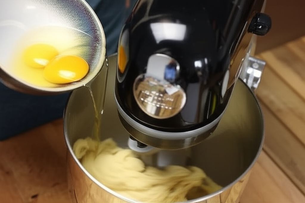 Zimną masę umieść w kielichu robota kuchennego i rozpocznij wyrabianie ciasta dodając jajka jedno po drugim.