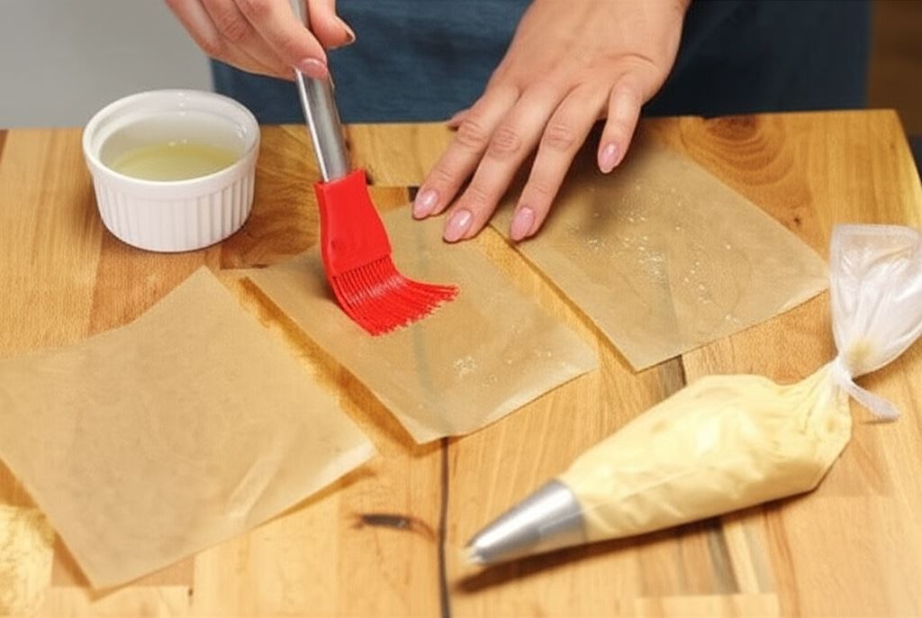 Umieść farsz w szprycy cukierniczej. Z papieru pergaminowego wytnij kwadraty o wymiarze około 10 cm i nasmaruj je olejem.