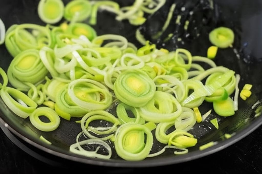 Pokrój por w talarki i smaż na oliwie aż się zeszkli.