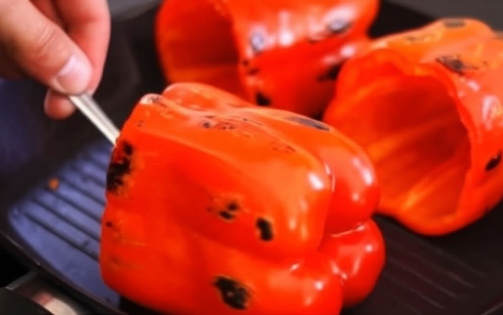 Upiecz czerwone papryki na grillu i pokrój w krążki.