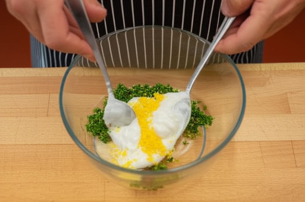 W miseczce połącz majonez z musztardą, skórką cytryny, pesto i posiekaną natką pietruszki.