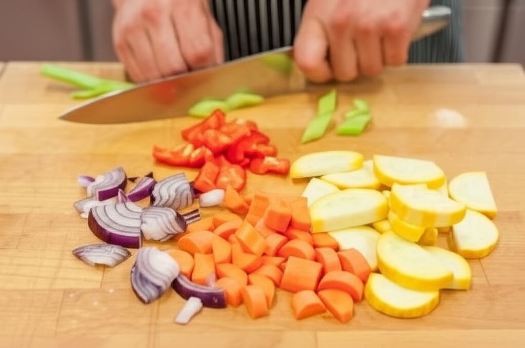 Wszystkie warzywa posiekaj: marchewkę i cukinię pokrój w półplasterki, paprykę oraz cebulę w małe kawałki, zaś selera pozbaw włókien i pokrój w drobniejsze części ukośnie.