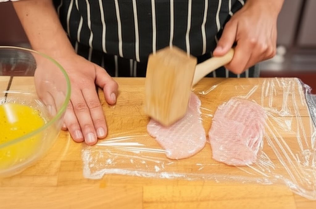 Piersi opłucz i osusz, potem przekrój każdą na pół wzdłuż, uzyskując dwa cienkie płaty. Każdy płat delikatnie rozbij tłuczkiem. By mięso nie uległo rozerwaniu, umieść je pomiędzy dwoma arkuszami folii spożywczej.