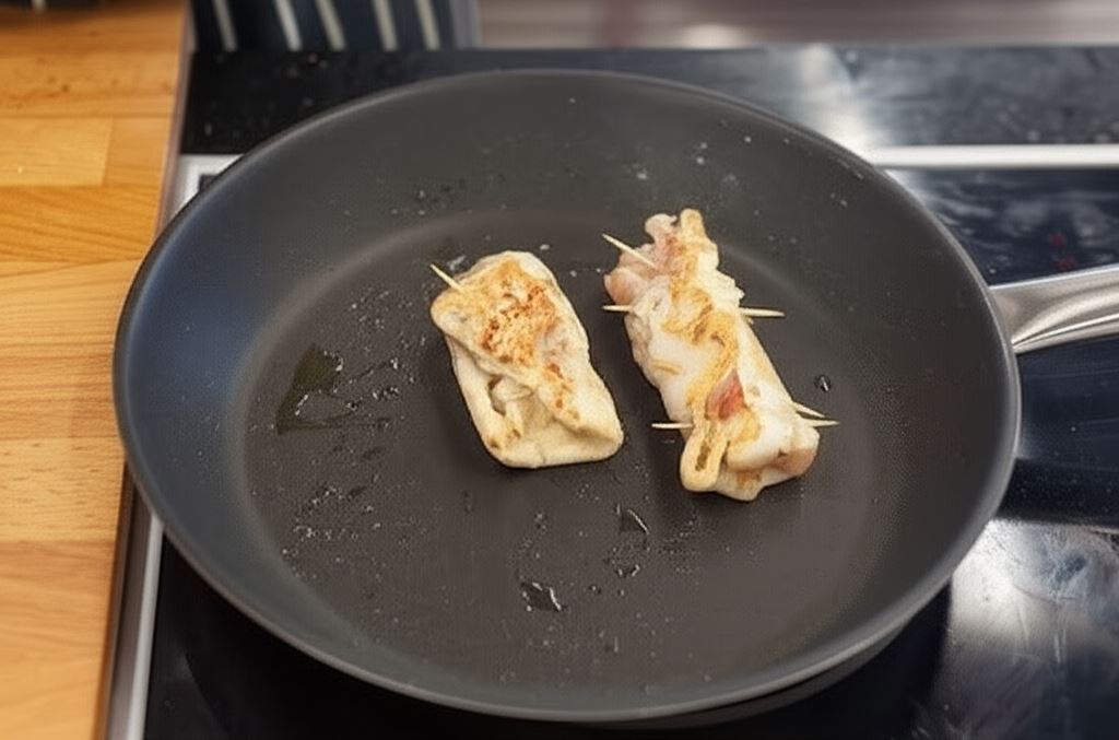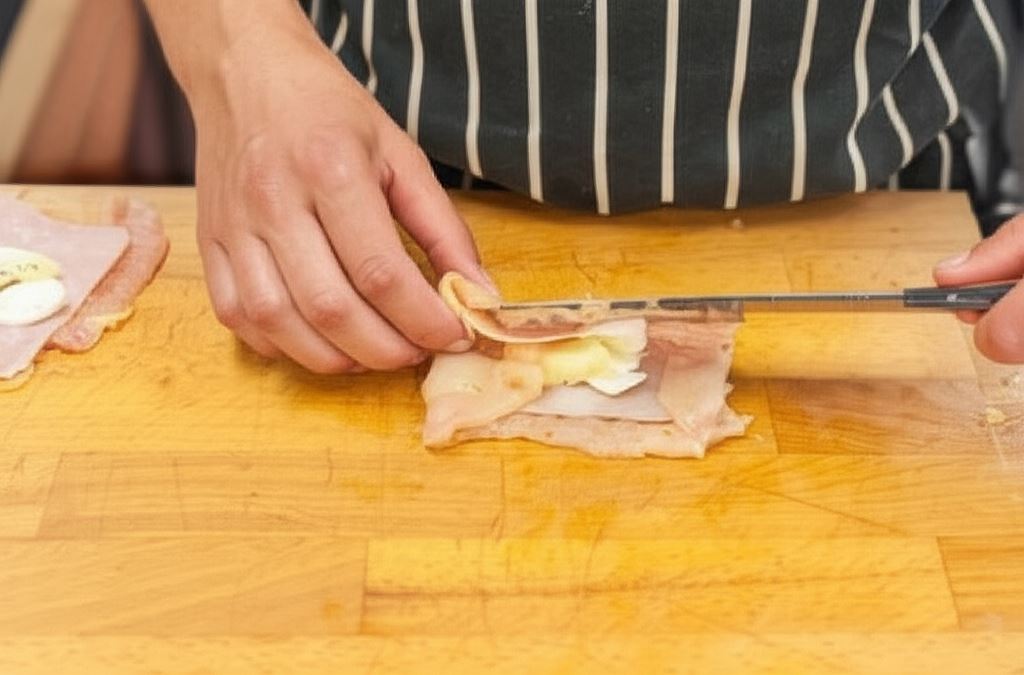 Technika zawijania mięsa w „kopertę” to sprawdzony sposób na utrzymanie wszystkich składników w środku. Ważne, aby dokładnie zawinąć brzegi do środka i spiąć wykałaczką. Dzięki temu podczas smażenia soki i aromaty pozostaną wewnątrz roladki, a ser nie wycieknie na patelnię.