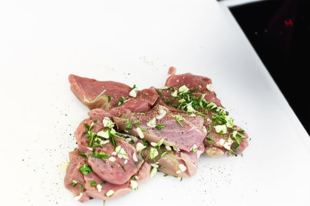 Mięso opłucz, usuń wszystkie żyłki i błony, osusz, obtocz w posiekanym tymianku, rozmarynie, soli, pieprzu i czosnku. Tak przygotowane mięso odłóż w chłodnym miejscu na około 2 godziny.
