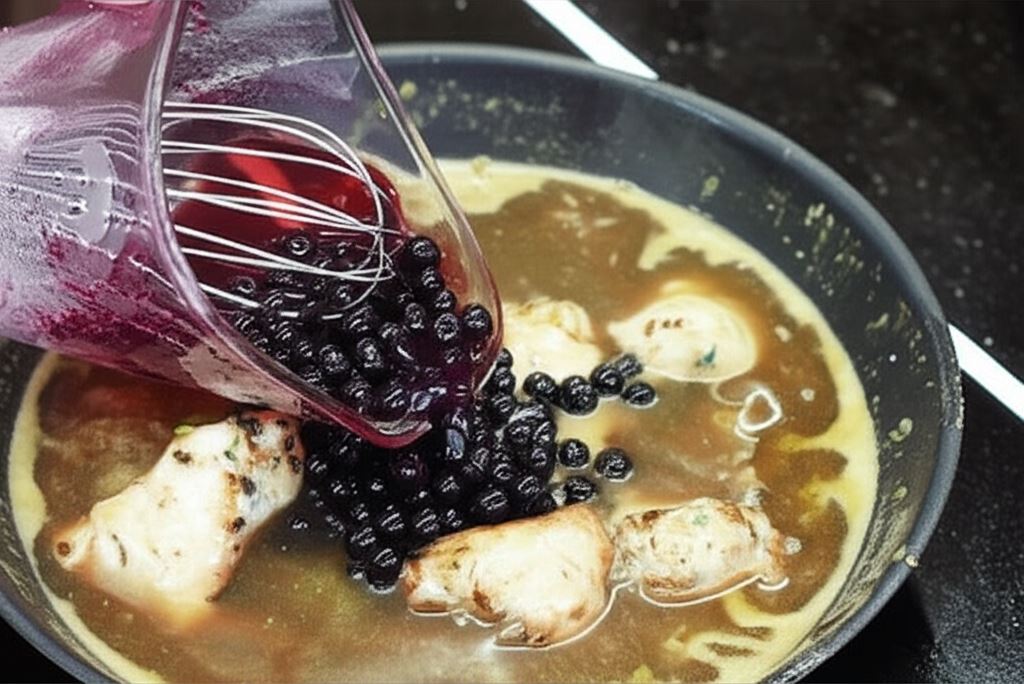 Przy końcu duszenia wsyp czarną porzeczkę, gotuj całość jeszcze przez około 8 minut. Następnie mięso odłóż na bok, a sos zblenduj. Plastry cielęciny serwuj na ziemniakach, oblane sosem.