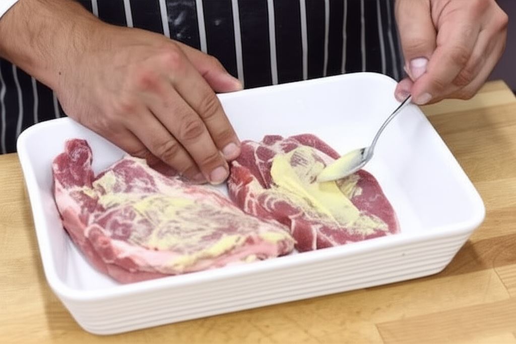 Mięso posmaruj musztardą. Następnie posyp mąką i przysmaż z obu stron na patelni.
