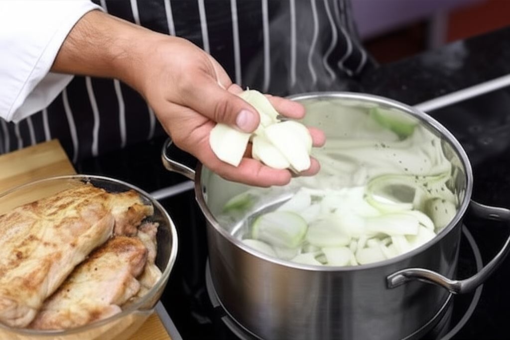 W rondlu zrumień posiekaną w piórka cebulę, wsyp łyżkę mąki i smaż, aż stanie się szklista. Dodaj podsmażone mięso.