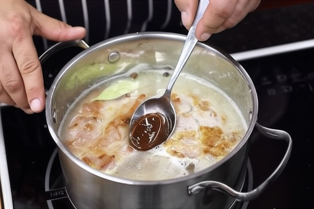 Teraz dolej 1 litr wody, wsyp majeranek, liść laurowy, ziele angielskie i Sos do pieczeni ciemny Knorr, który wzbogaci aromat potrawy.