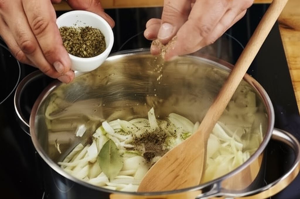 Cebule posiekaj w piórka i zrumień w garnku na gorącym oleju, wsyp majeranek, liść laurowy i ziele.