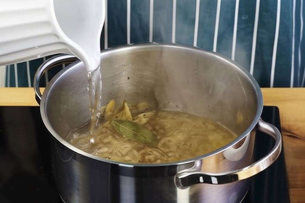 Kiedy cebula uzyska złoty kolor, dodaj resztę mąki i podsmaż razem. Potem wlej 1 l gotującej się wody.