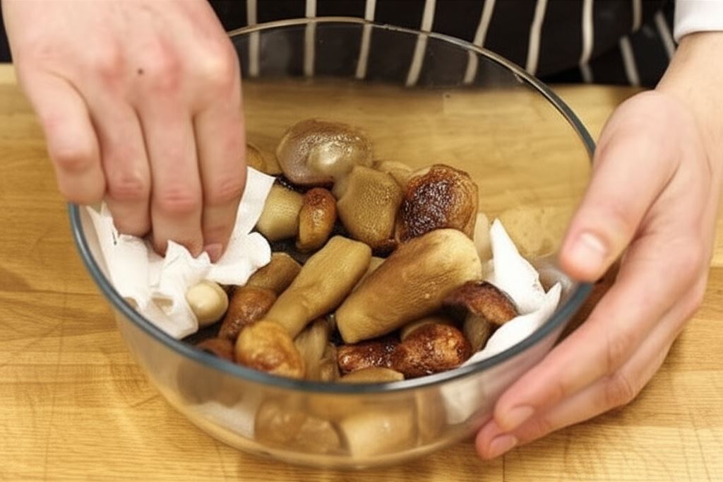 Grzyby opłucz, wysusz, przetnij na połowę lub jeśli są większe pokrój je na cztery kawałki.