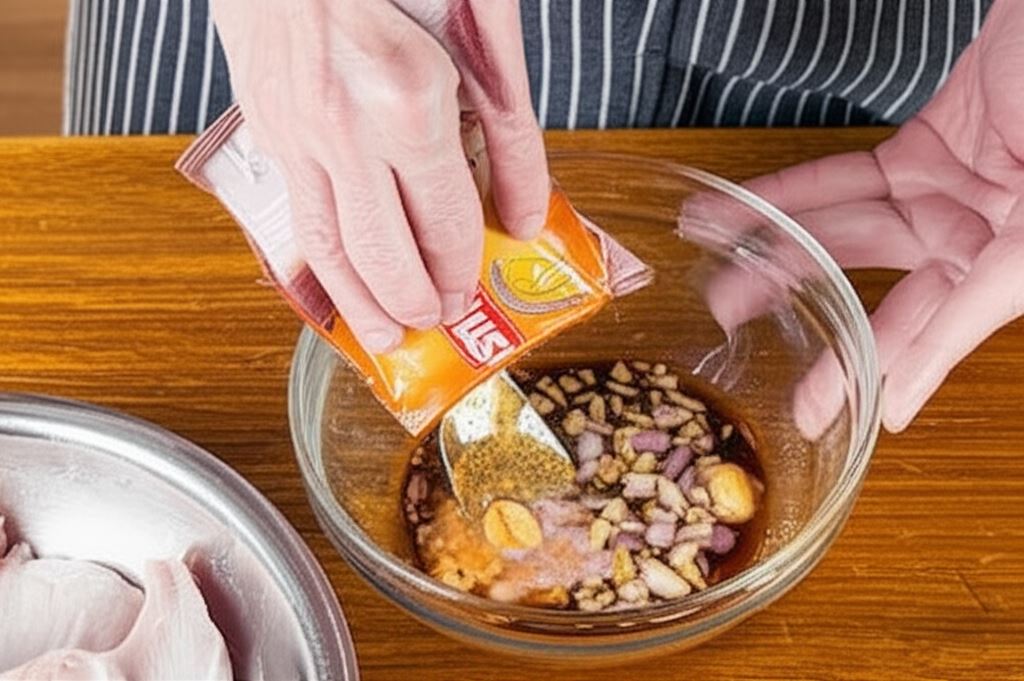 Sos sojowy połącz z drobno posiekaną dymką, pieprzem, cukrem, czosnkiem przepuszczonym przez praskę, łyżeczką oleju i 3 łyżkami wody. Wsyp przyprawę do kurczaka Knorr.