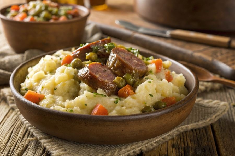 Stamppot to kwintesencja holenderskiej kuchni tradycyjnej, której historia sięga XVI wieku. Nazwa pochodzi od dwóch holenderskich słów: „stamp” (ubijać) i „pot” (garnek), co doskonale oddaje technikę przygotowania tego dania. Pierwotnie stamppot powstał jako praktyczne rozwiązanie kulinarnego problemu – jak wykorzystać sezonowe warzywa korzeniowe i ziemniaki, aby stworzyć pożywny posiłek na zimowe miesiące.