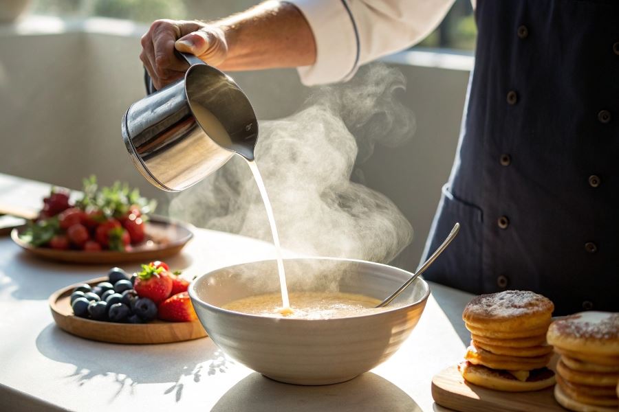 Wskazówka eksperta: Pierwszą porcję ciasta warto „poświęcić” na rozgrzanie i natłuszczenie patelni. Kolejne naleśniki będą już idealnie równe i złociste.