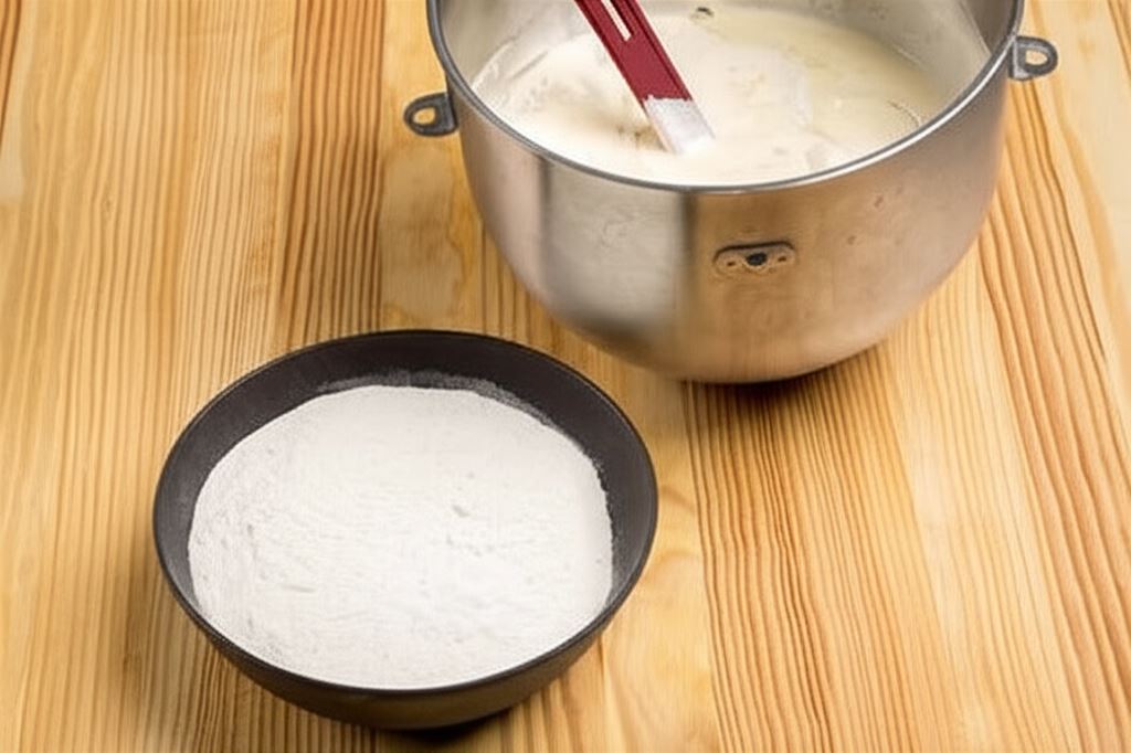 Teraz wsyp do biszkoptu przesianą mąkę pszenną z proszkiem do pieczenia i zamieszaj delikatną łyżką.