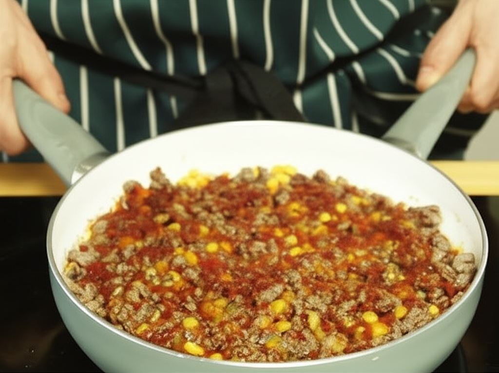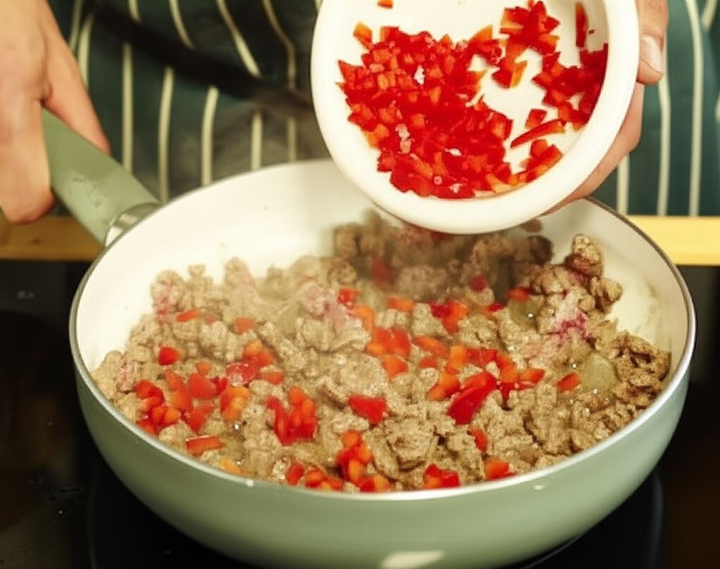 Rozpocznij przygotowanie enchiladas chili con carne od posiekania czerwonej papryki w małą kostkę. Następnie podgrzej 3 łyżki oleju na patelni. Kiedy będzie już rozgrzana, dodaj na nią 350 gramów mielonego mięsa i smaż je aż woda odparuje. Następnie wsyp na patelnię wcześniej pokrojoną paprykę oraz pół szklanki odcedzonej kukurydzy z puszki. Wymieszaj starannie wszystkie składniki.