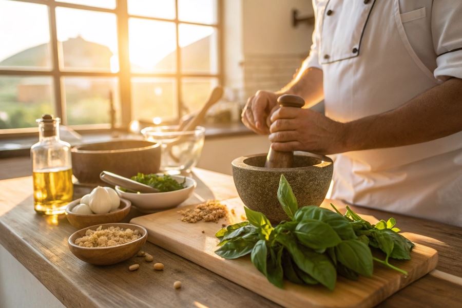 Tradycyjny moździerz marmurowy – ucieranie składników uwalnia olejki eteryczne, tworząc intensywniejszy aromat. Proces jest pracochłonny, ale rezultat – nieporównywalny. Składniki dodaje się stopniowo: najpierw czosnek z solą, potem orzechy piniowe, bazylię i na końcu ser z oliwą.