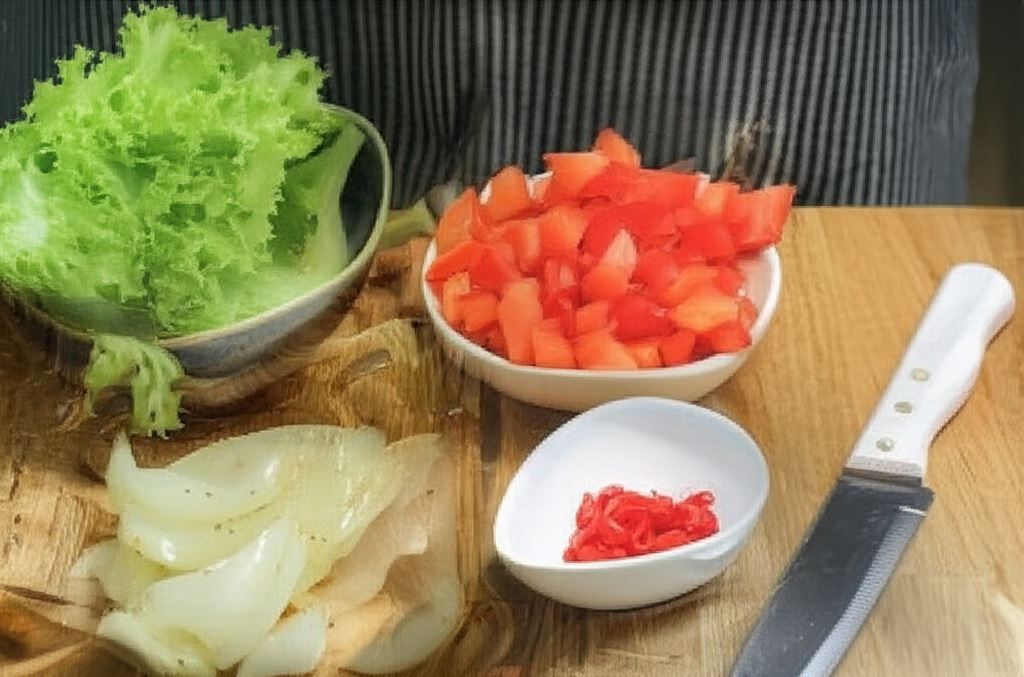 Cebulę, paprykę i chili pokrój w kostkę. Sałatę podrzyj na drobniejsze kawałki.