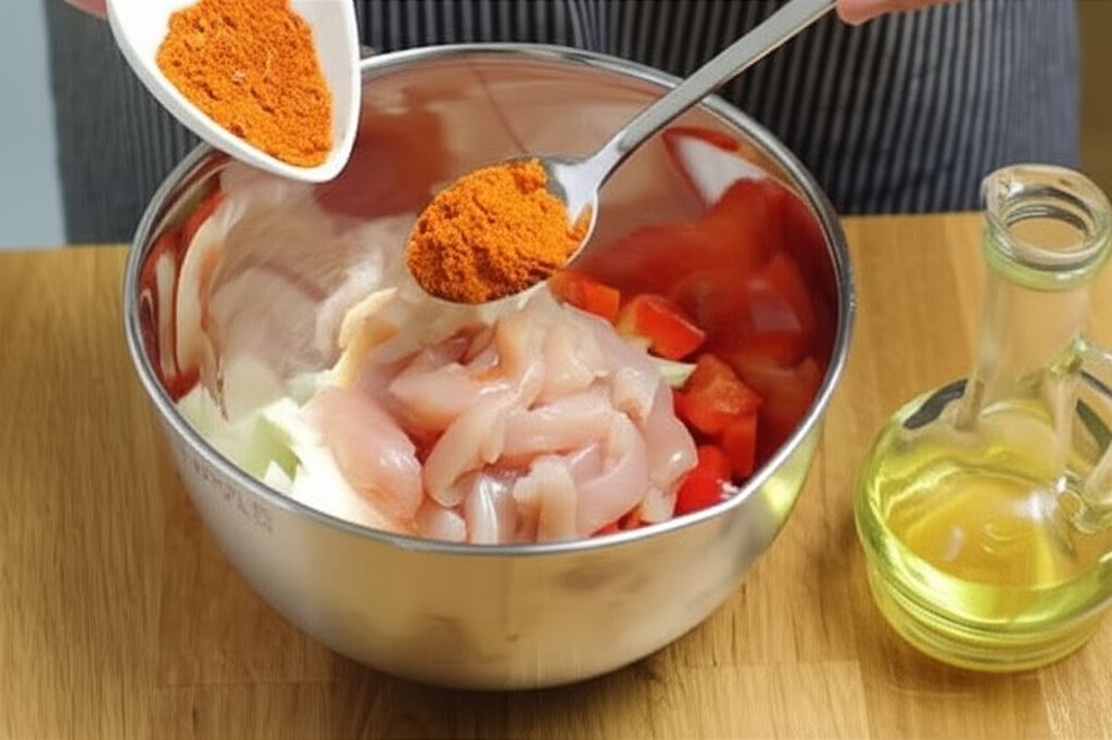 Kurczaka potnij na paski, umieść w misce, wlej olej, dodaj warzywa i przyprawę Knorr. Porządnie wymieszaj.